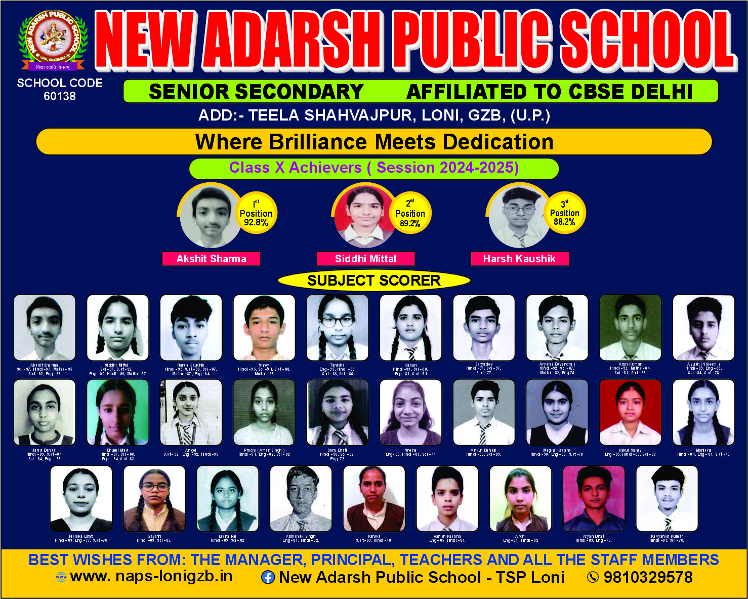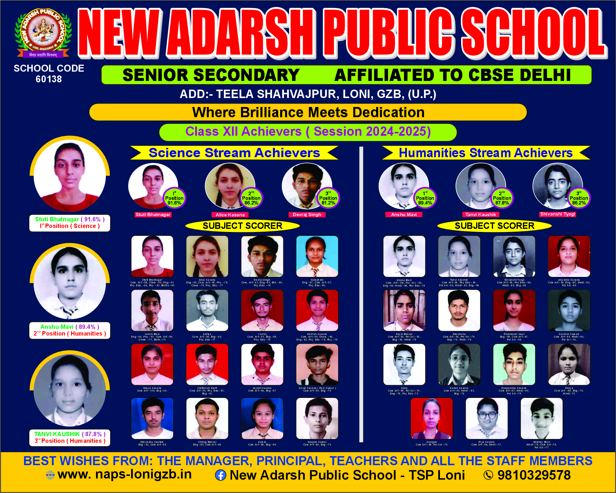 NEW ADARSH PUBLIC SCHOOL is Affiliated to CBSE Board, New Delhi. Its Affiliation Number is 2130297.
